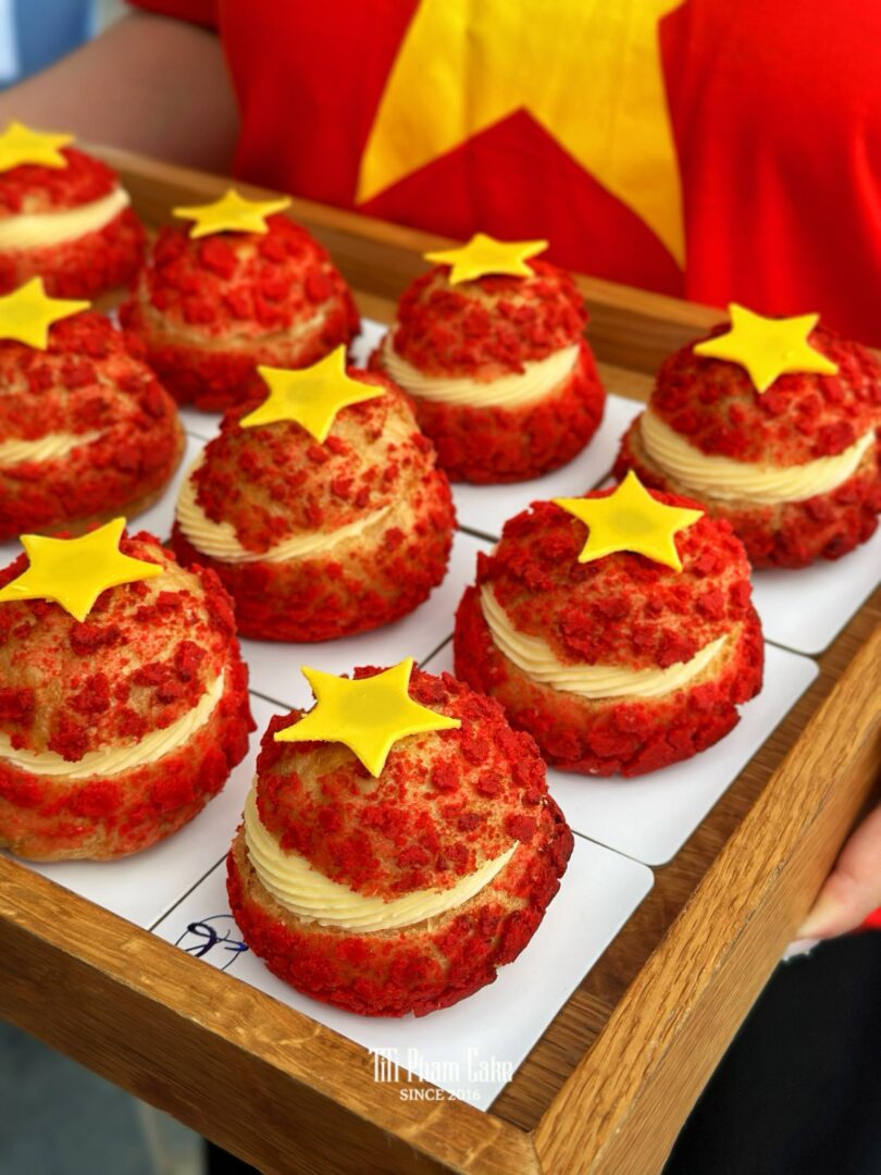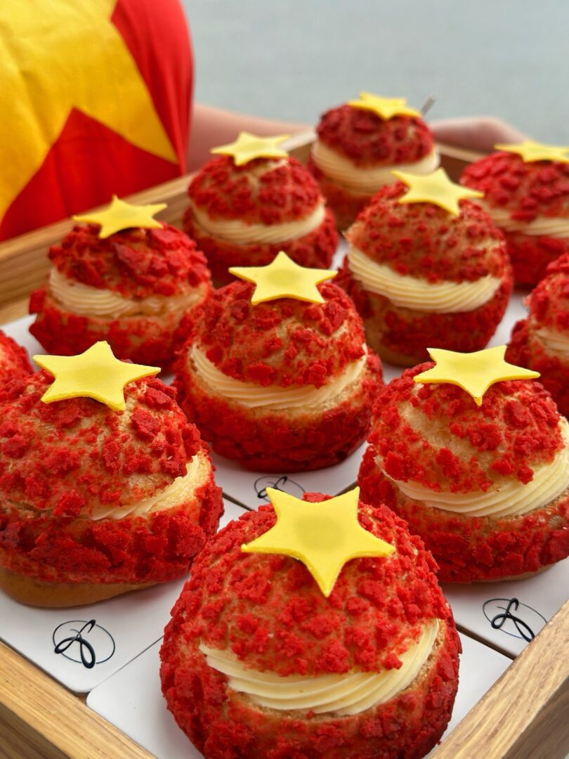 Lớp Vỏ Crumble Đỏ Rực: Vỏ bánh Choux giòn nhẹ, được phủ lớp crumble màu đỏ rực rỡ, tượng trưng cho tinh thần lễ hội và niềm tự hào. Độ giòn tan của vỏ bánh chính là màn dạo đầu hoàn hảo cho phần nhân bùng nổ phía sau.