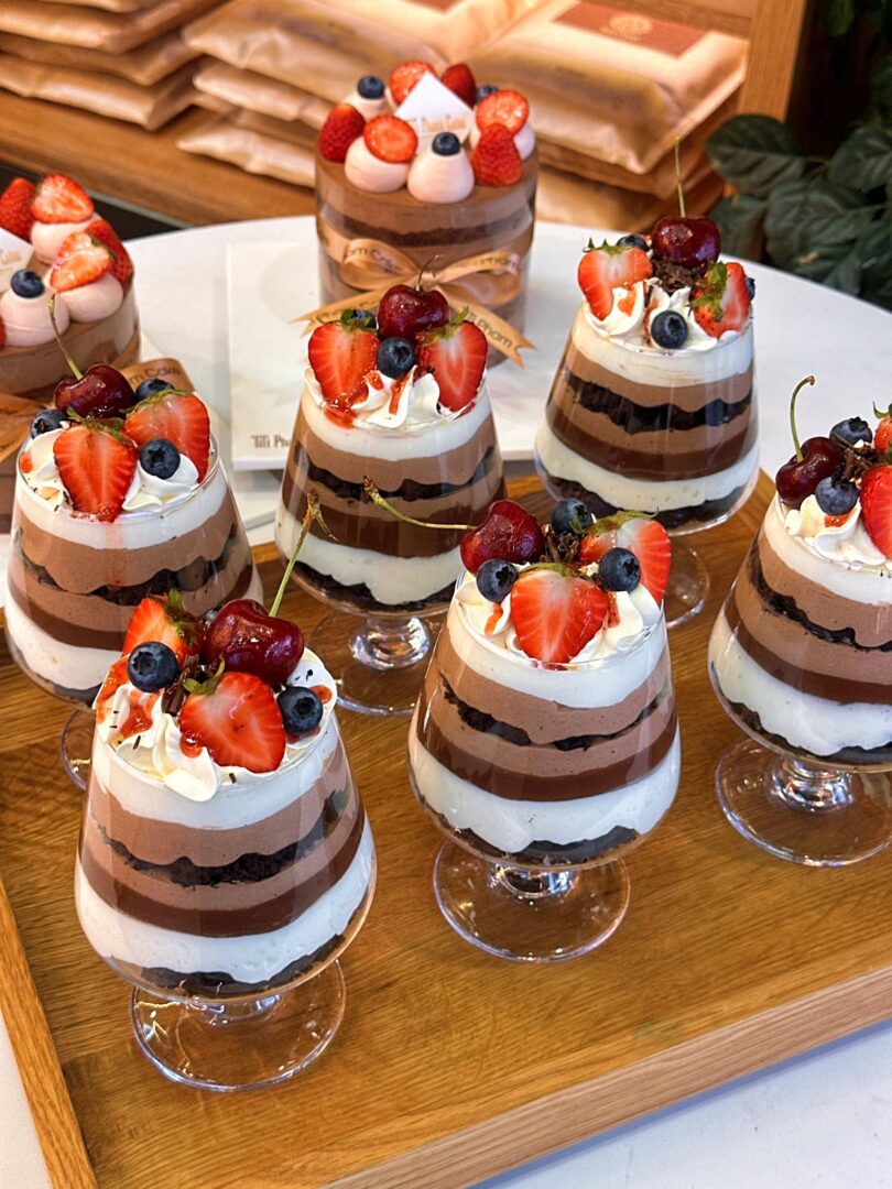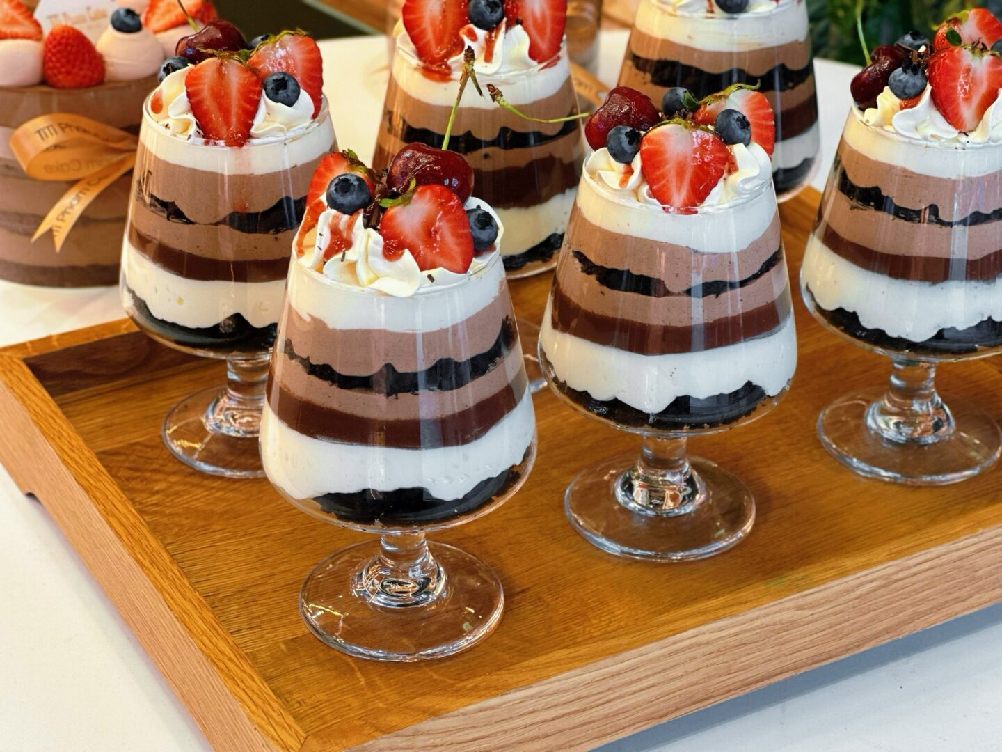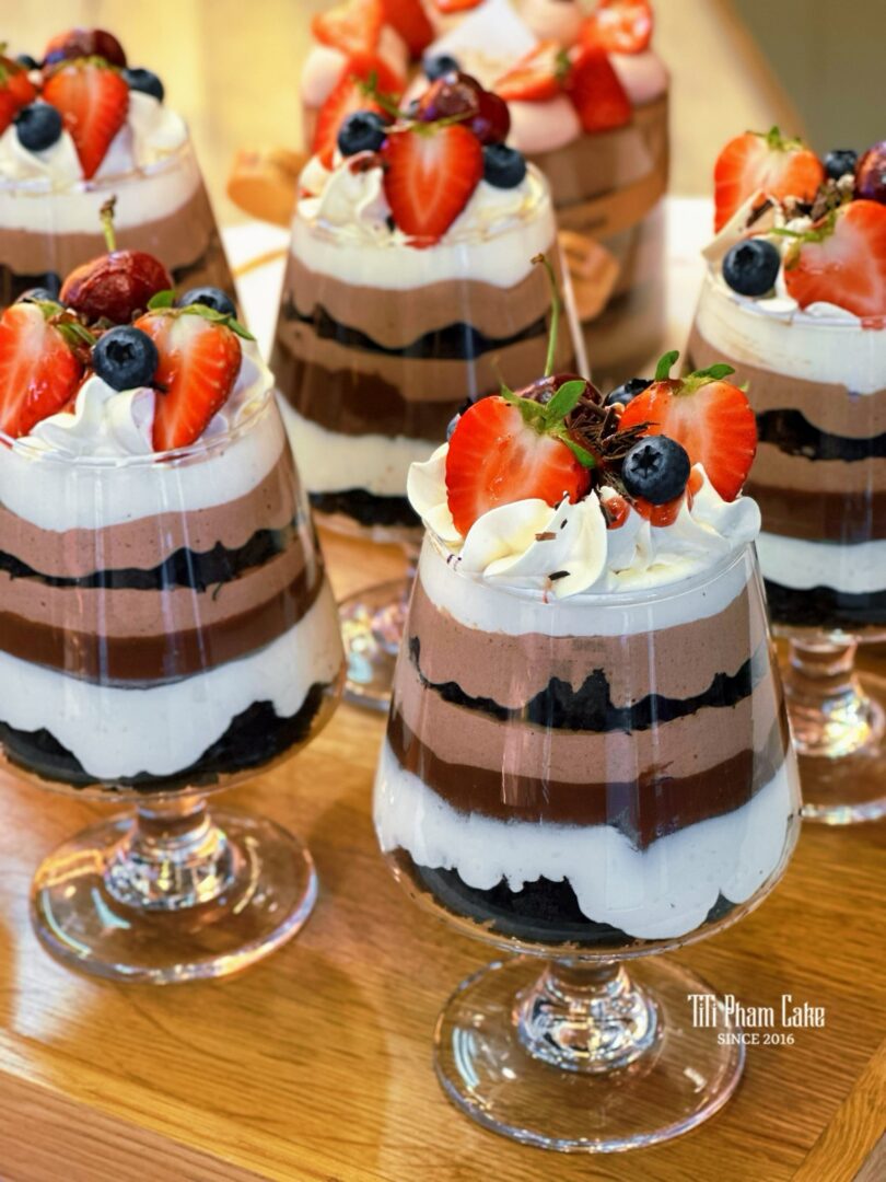 • Trái cây tươi mát: Dâu tây và việt quất tươi giúp cân bằng vị giác, mang lại cảm giác chill đúng chuẩn một bữa tiệc ngọt.