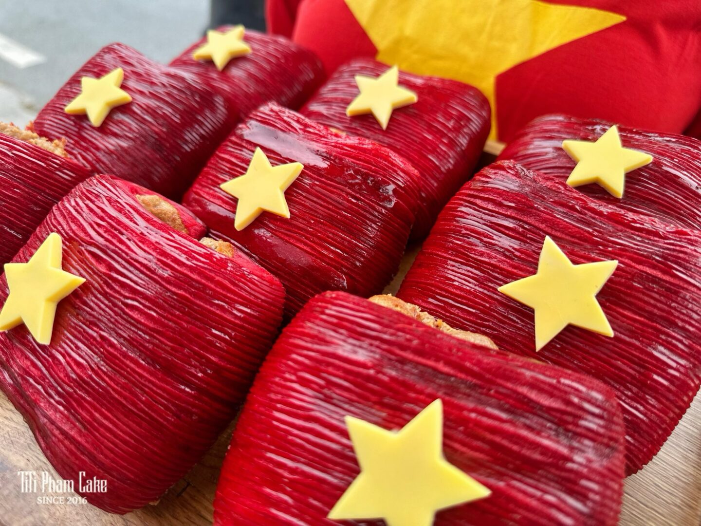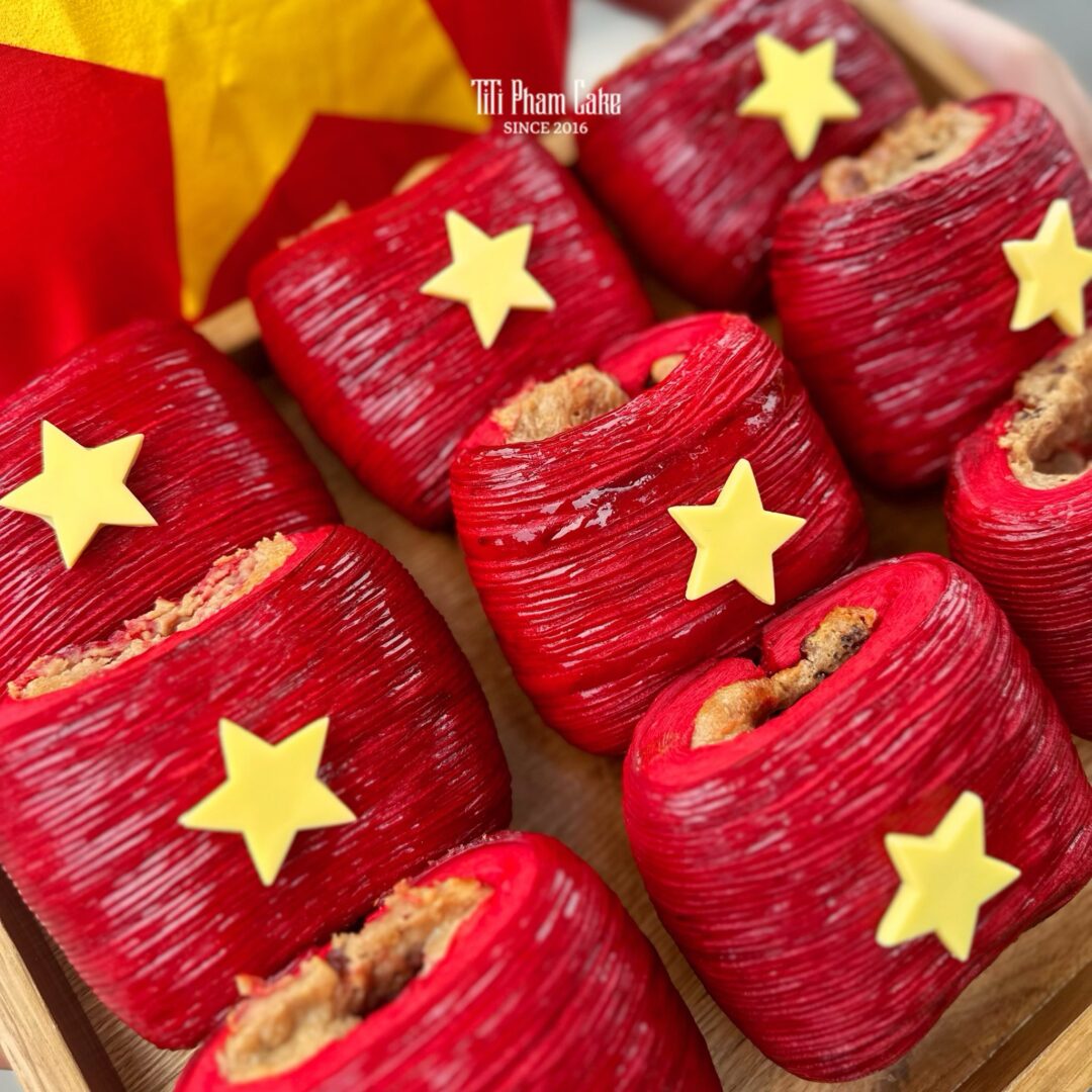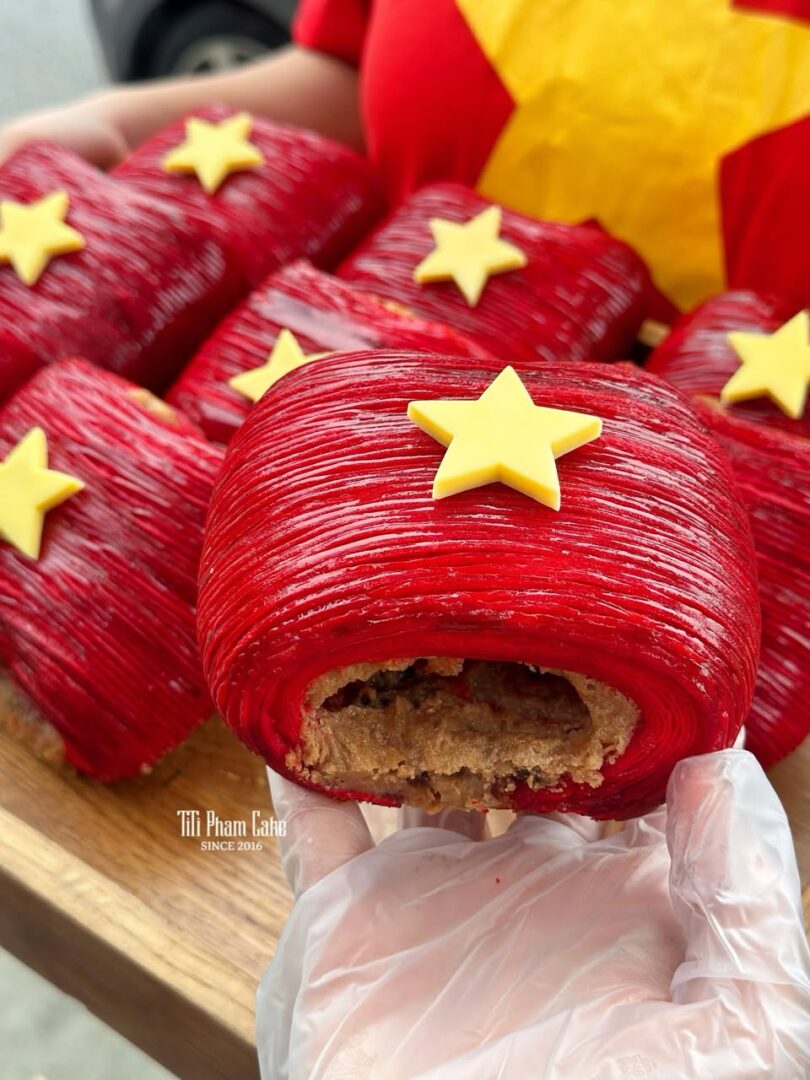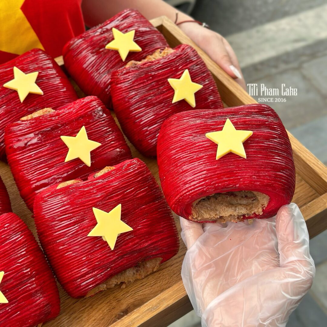 Sắc Đỏ Rực Rỡ & Ngôi Sao Vàng Nổi Bật: Lớp vỏ bánh được “nhuộm” sắc đỏ nồng nàn, điểm xuyết ngôi sao vàng thủ công đầy tinh tế. Một thiết kế bắt mắt, mang đậm tinh thần ngày lễ, lý tưởng để bạn check-in và chia sẻ niềm vui.