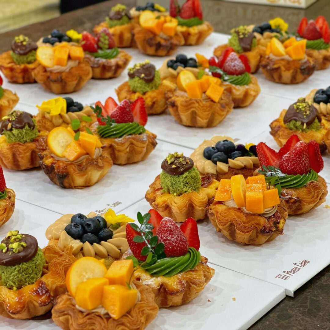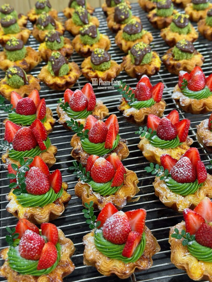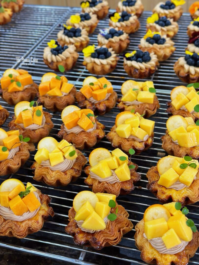 Vỏ Tart Ngàn Lớp: Được làm từ bơ cán lớp thượng hạng, nướng vàng ươm để đạt độ giòn rụm và thơm nức mùi bơ đặc trưng.